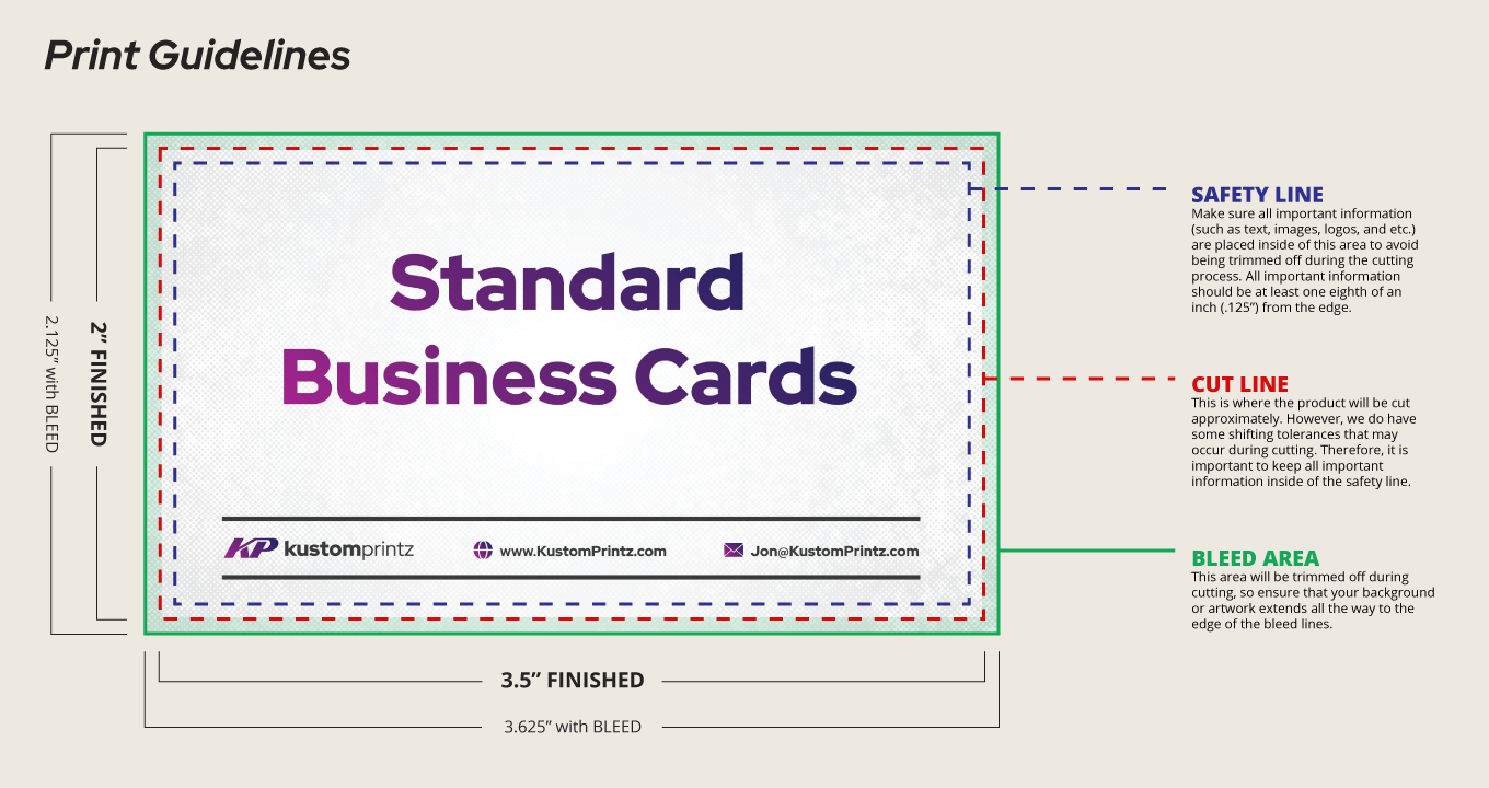 Business cards are more than contact information — with the right design, they showcase your brand and help establish professionalism and credibility. The standard business card size is 2” x 3.5”, similar to a credit card for convenient wallet or pocket storage.